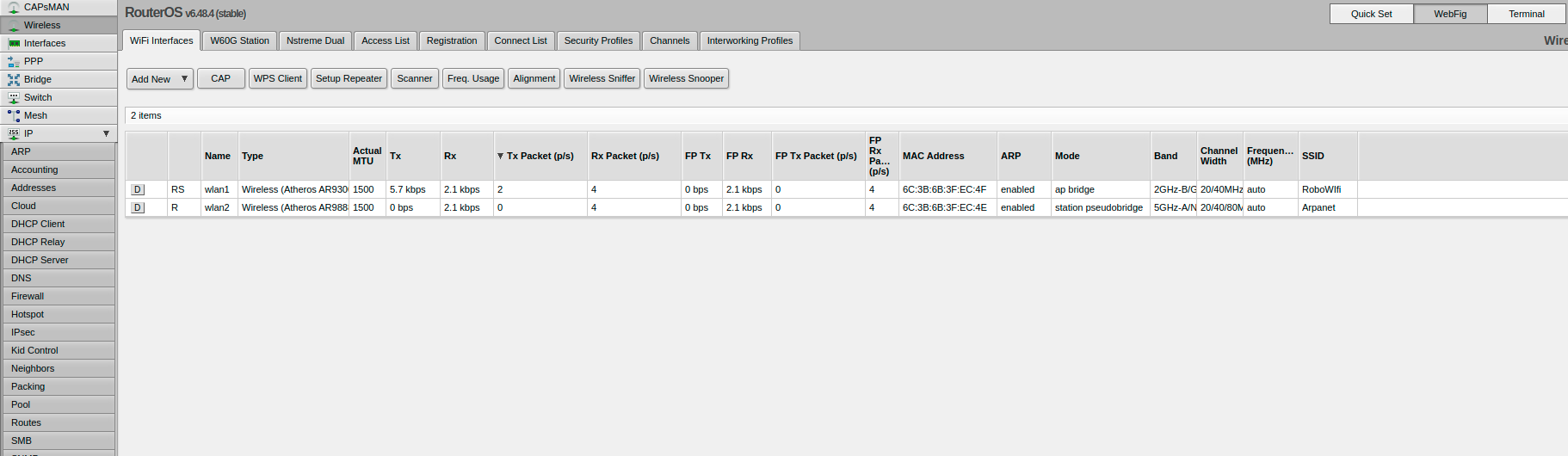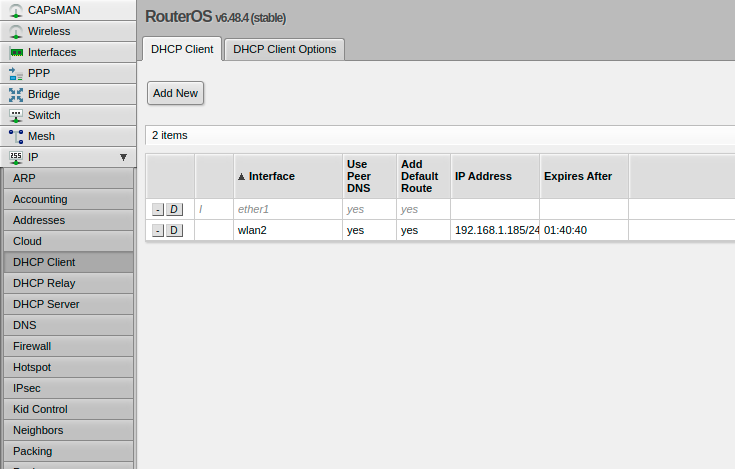 The network topology of this setup is fairly simple but provides useful functionality. The Router is setup with eth0 (in Mikrotik it is ether1, counting from 1 instead of 0) as a WAN port and the rest of the 4 ports as a switch. Where the deviation from a normal router setup is found is in the wifi setup. Unlike a normal router which would have SSIDs being broadcast on both the 2.4 and 5Ghz bands, in this setup the 5Ghz band will act as a client connected to another wifi network acting as another wan source with only the 2.4Ghz band broadcasting the SSID.