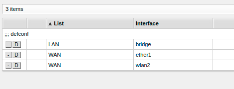 Interface List, here the WAN and LAN interfaces are defined. By adding ether1 to the WAN list we can either provide internet through a client wifi address or the first ethernet port.