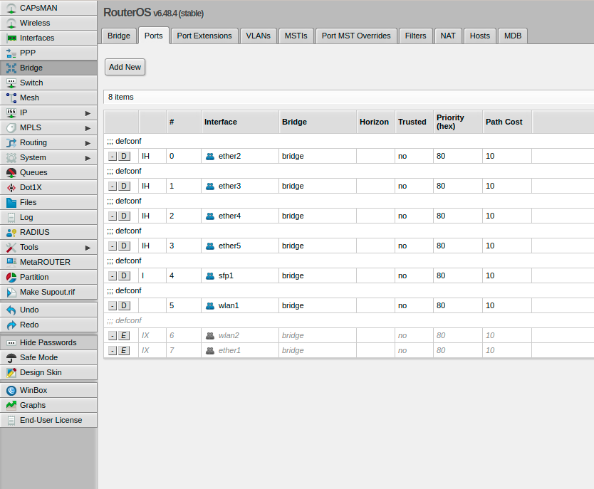 Port Assignments, here disable ether1 since it will be setup as a wan port not as a lan port.